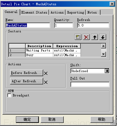 上图中,左图中只需要设定饼状图数据更新间隔周期Refresh项目即可,这里设定为每隔5分钟更新一次数据;模型中要求饼状图能够动态显示机床处于特定状态的比率,通过选择Pie Chart元素细节对话框中的Element States页,如右图所示,将Display Element States前面的选项选中,然后在Element Name中选定对应的元素MachA即可。