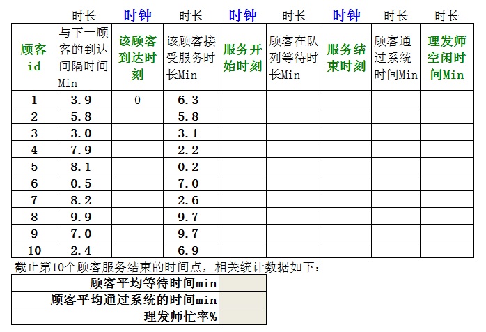 2、在单队列单服务台排队系统中,考虑顾客到达时间和服务时间服从下表所示数据的状态下,完成10个顾客到达和服务过程的手工仿真(仅到达10个顾客)表格的填写:
