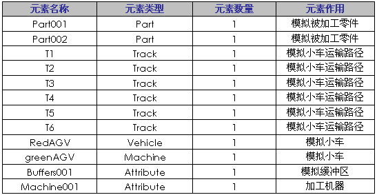该模型的元素较为复杂,两种零件分别在不同的AGV小车上装载,并且两种AGV小车在去往装载零件的路径都不相同,但两辆小车回程路径是一样的。