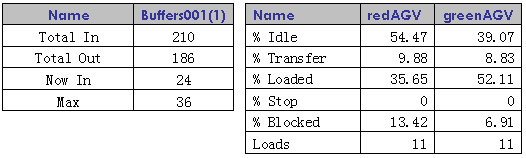 上表可以看出,buffers001现有库存24个。两个AGV小车的空闲率为54.47和39.07.满足系统需求。如果机器能提高效率,buffers001中的库存可以减少很多。因此可以判断machine001为该模型中的瓶颈。