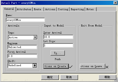 在直方图中存储数据和在时间序列图记录数据的方式是不同的,向直方图中记录数据一般使用Record函数实现,例如本例中,为了实现每隔10分钟将Buf中部件A的存储量记录到直方图partAInBuf中,设计了一个等间隔进入模型的零件元素every10Min(双击该元素,其细节设计对话框如下图),该元素每隔10分钟到达一个,到达时在其Actions on Create 设定语句:RECORD NPARTS2 (Buf,A,1) in partAInBuf ,实现将当前Buf中部件A的存量记录进partAInBuf直方图中。