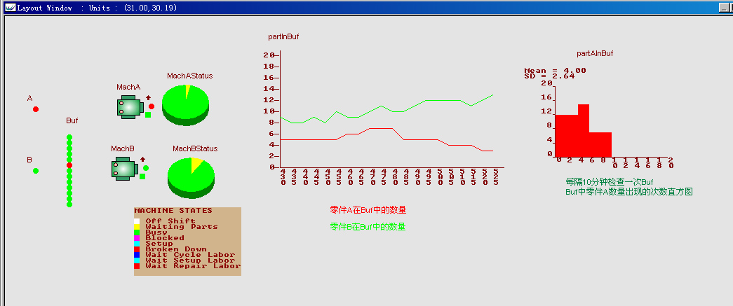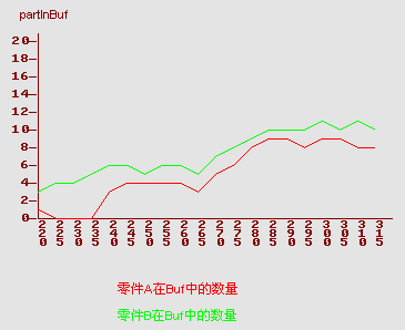 该模型模拟一个制造车间有两台机床分别加工部件A和部件B,部件A和B随机到达车间并存放在车间存放区Buf,由于部件的随机到达和机床加工时间的随机性,将导致存放区中两种部件可能会有较多的存储量。使用图形元素实时统计下列项目: