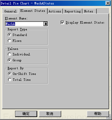 上图中,左图中只需要设定饼状图数据更新间隔周期Refresh项目即可,这里设定为每隔5分钟更新一次数据;模型中要求饼状图能够动态显示机床处于特定状态的比率,通过选择Pie Chart元素细节对话框中的Element States页,如右图所示,将Display Element States前面的选项选中,然后在Element Name中选定对应的元素MachA即可。