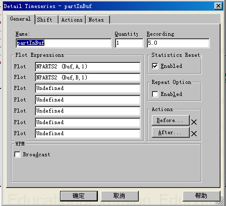 Plot Expressions项目:该项目可以设置7个数据表达式,该表达式的数据结果将以时间序列曲线的形式显示在时间序列图上,根据Recording设置间隔的大小不断记录数据,在示例中设置了两个表达式:NPARTS2 (Buf,A,1),NPARTS2 (Buf,B,1) ,这两个函数将返回在记录时刻存放区Buf中元素A和B的数量。